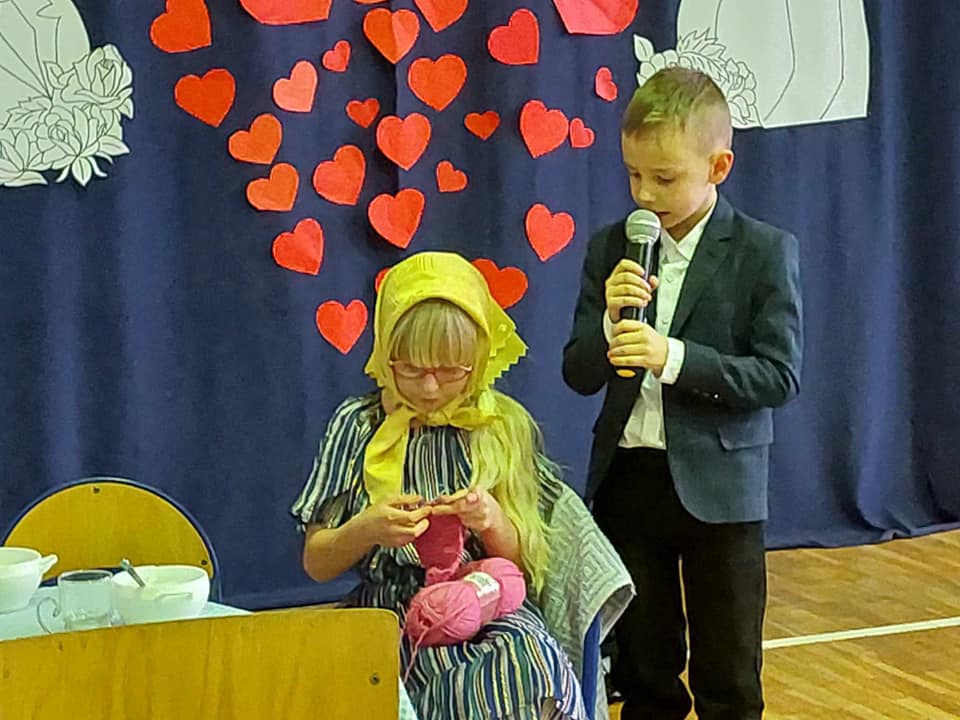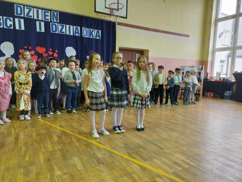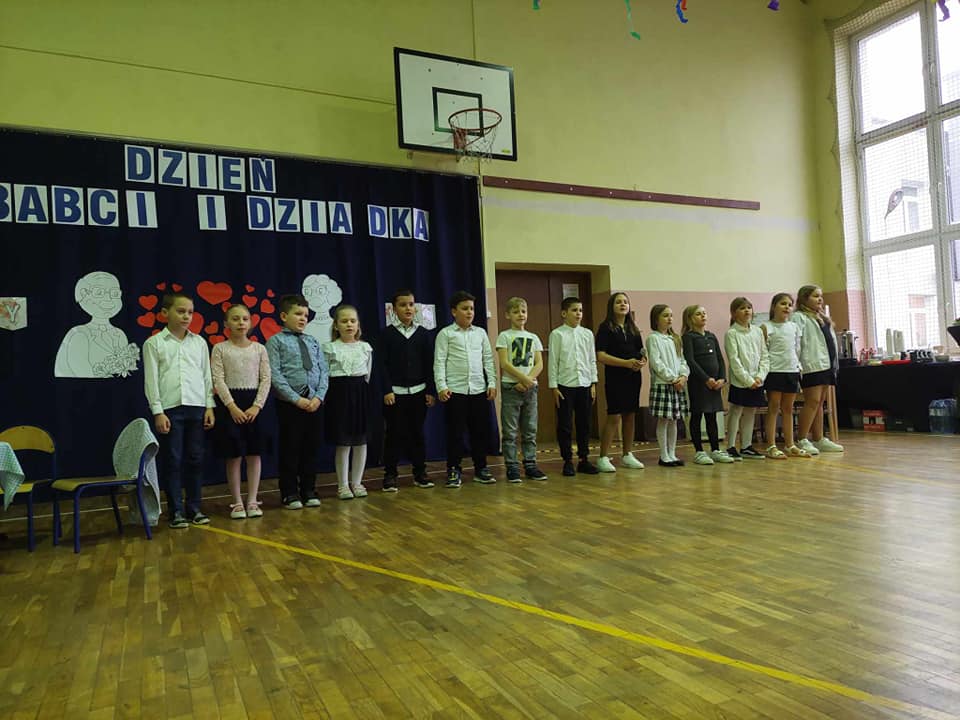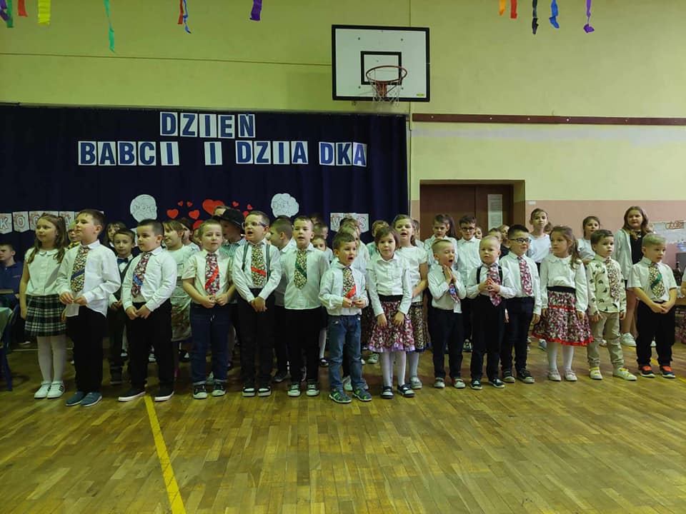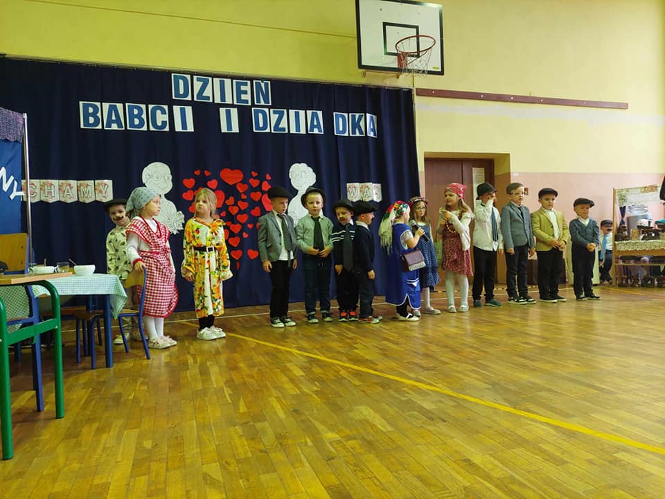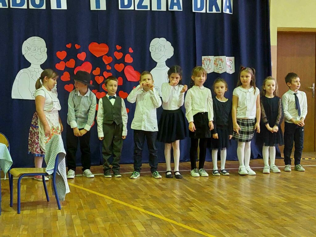 Artyści z przejęciem odtwarzali swoje role, a czcigodni goście ze wzruszeniem odbierali czułe słowa kierowane pod ich adresem. Duma rozpierała ich serca, że mają tak utalentowane wnuczęta. Mali artyści z kl.,,0” przenieśli wszystkich do czasów PRL, w których to poznali się dziadkowie. Świetnym tańcem uwiecznili swój występ. Klasa I i II przedstawiła scenki z życia oraz piosenki, klasa III złożyła dziadkom życzenia i podziękowała piosenką. Artyści z kl.I i II zagrali ,,Sto lat” na instrumentach.