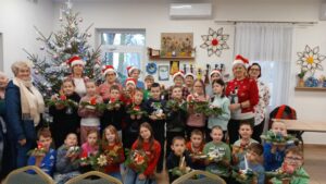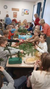 Uczniowie klas 0-3 brali udział w przygotowaniu stroików świątecznych na kiermasz bożonarodzeniowy.